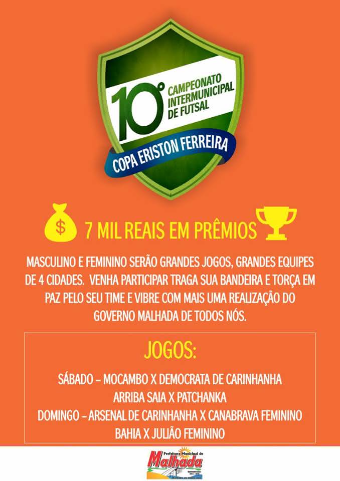 Neste sábado (3), a quadra Poliesportiva de Malhada, mais uma vez será o super palco de mais espetáculos. Na reta final o campeonato 10º Campeonato Intermunicipal de Futsal Copa Eriston Ferreira, começa a pega fogo.