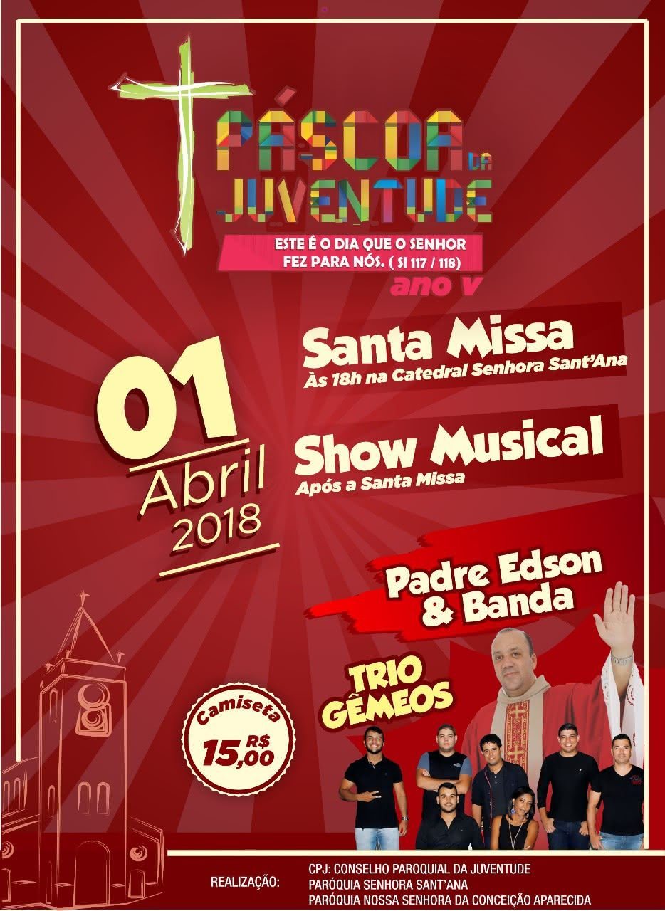 O Conselho Paroquial da Juventude das Paróquias Senhora Santana e Nossa Senhora da Conceição Aparecida de Caetité promoverá dia 01 de abril a 5ª edição da Páscoa da Juventude, com missa às 18 h e logo após o Padre Edson Rocha e sua banda da Paróquia Senhor Bom Jesus de Malhas de Pedras, assumem o trio elétrico cantando músicas de louvor e adoração, com seu percurso saindo da esplanada da Catedral, passando pela Avenida Santana e descendo a Rua Barão.