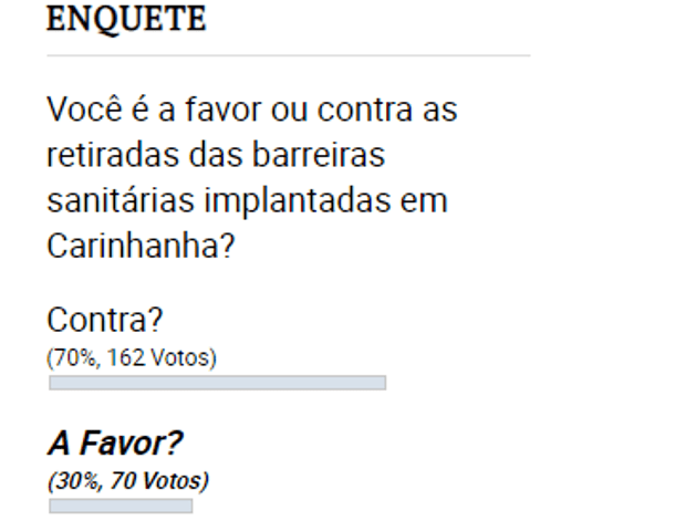 A enquete mostra que 70% dos internautas são contra o prefeito de Carinhanha, Geraldo Pereira Costa (Piau), retirar as barreiras sanitárias.