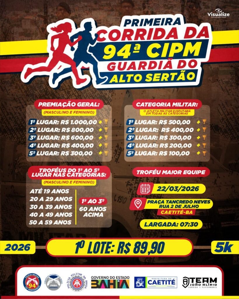 Organizado pela 94ª Companhia Independente da Polícia Militar (94ª CIPM), o evento terá quase R$ 5 mil em premiações, distribuídos em diversas categorias. A largada está prevista para 07h30, na Praça Tancredo Neves, localizada na Rua 2 de Julho, na região central da cidade.