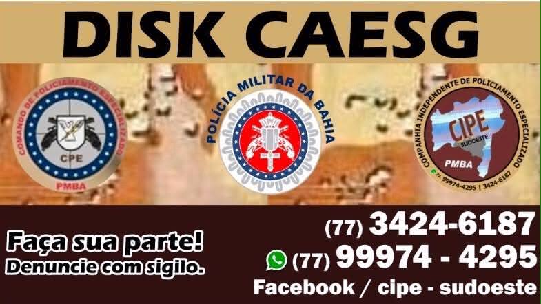 A CAESG CIPE SUDOESTE criou um canal no qual aproxima cada vez mais a população da polícia. O DISK CAESG foi criado Com o objetivo de melhor atender a população do sudoeste baiano pelo qual o cidadão poderá passar INFORMAÇÕES que possam ajudar na segurança pública e assistência ao público.