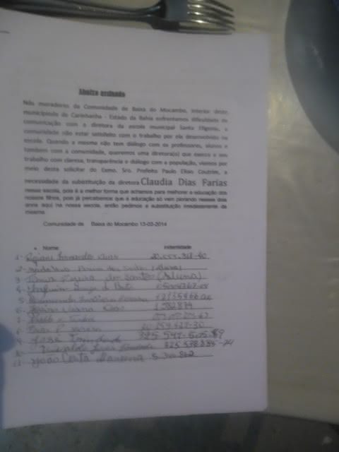 O portal Folha do Vale recebeu na manhã da última quinta-feira, 19 de março, um abaixo-assinado dos moradores da comunidade de Baixa do Mocambo, no interior do município de Carinhanha, no oeste da Bahia. Segundo o documento assinado pelos pais dos alunos, eles não estão satisfeito com o trabalho da diretora Claudia Dias Farias, que não tem dialogo com professores, alunos e também com a comunidade.