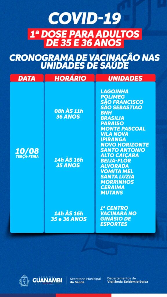 Os adultos de 35 anos podem ser vacinados das 14h às 16 horas. Adultos de 35 e 36 anos também podem ser vacinados das 14h às 16 horas no Ginásio de Esportes.
