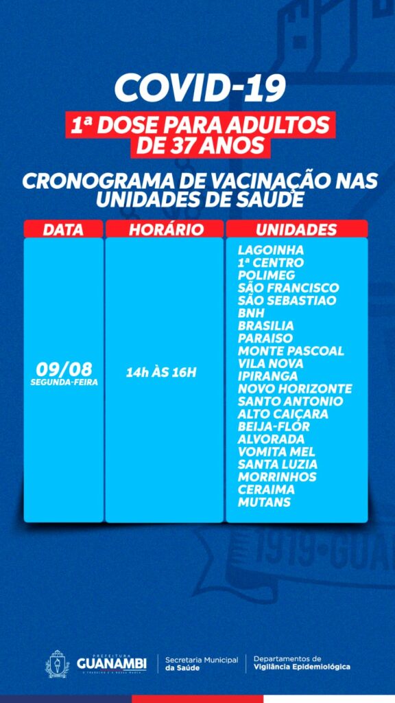 Planejado para acontece em dois dias, em diferentes horários e com dezenas de postos de vacinação, a Prefeitura de Guanambi divulga o cronograma de vacinação. Na segunda-feira (9), o público de 37 anos deve procurar um dos 21 postos de vacinação entre às 14h e 16 horas, para obter a primeira dose da vacina.