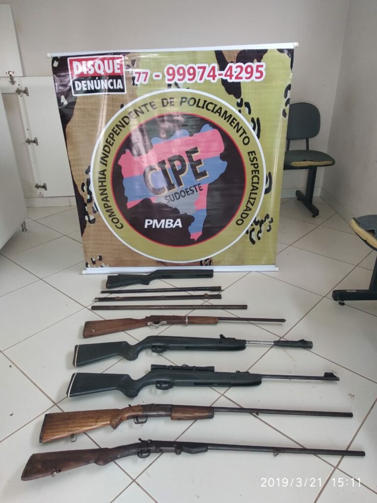 Os policiais apreenderam uma espingarda cartucheira, marca Lerap, calibre .32, nº de série não identificado,uma espingarda cartucheira, calibre .32, marca e numeração não identificadas,uma espingarda artesanal, sistema de funcionamento de alimentação antecarga, uma espingarda de ar comprimido, marca CBC, calibre 5.5(.22mm), cano 18 polegadas, nº HIF062963. Equipado com uma luneta de projeção 4/20, marca RF, uma espingarda de ar comprimido, marca CBC, calibre 5.5(.22mm), nº de série não identificado, cano 18 polegadas, um cano de espingarda cartucheira, calibre .36, um cano duplo de espingarda artesanal, um cano de espingarda artesanal e uma coronha de polímero, marca CBC, para espingarda de ar comprimido.