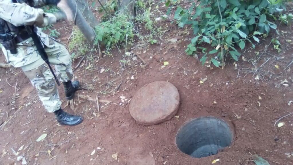 De acordo com os agentes, com o auxílio do pai do suspeito foi localizado um paiol (um compartimento de cimento com tampa de concreto, debaixo do chão, rodeado de algarobas), onde estavam escondidas várias espingardas, impermeabilizadas com uma câmara de borracha.
