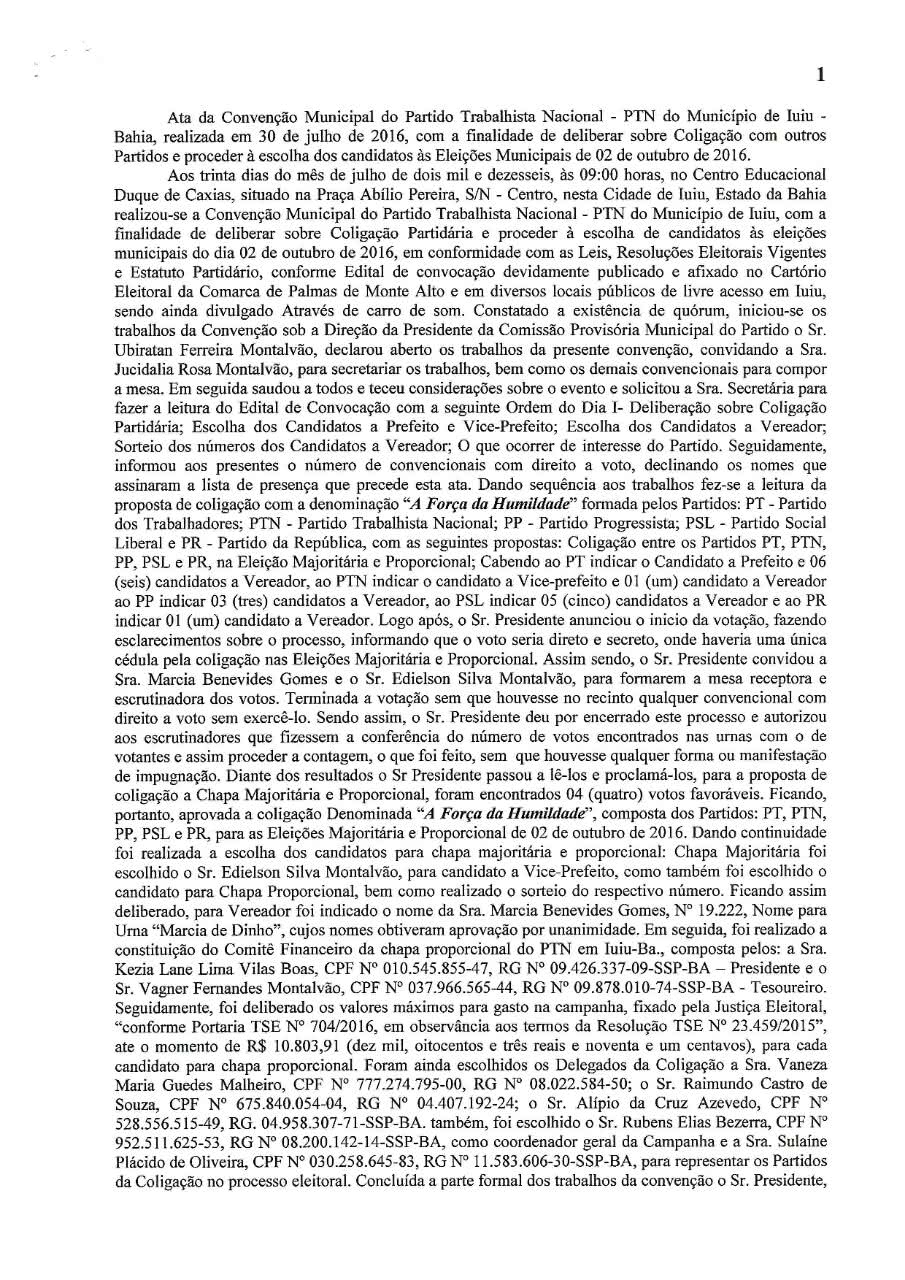 Constituída pelos partidos: PT, PTN, PP, PSL e PR do município de Iuiú, em atendimento a legislação eleitoral torna público as atas da supra citada coligação.