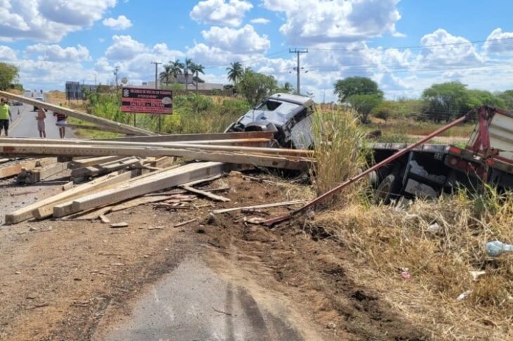 Carreta carregada com postes tomba na BR-030, em Guanambi