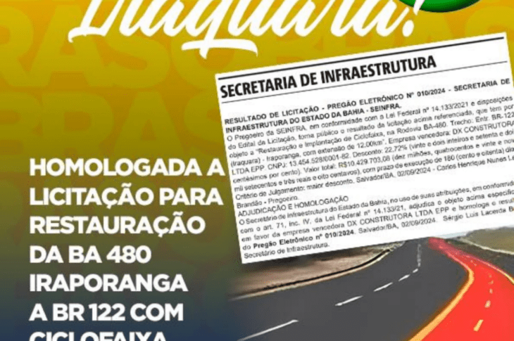 Homologada a licitação para restauração da BA-480: Iraporanga a BR-122, com ciclofaixa em Iraquara