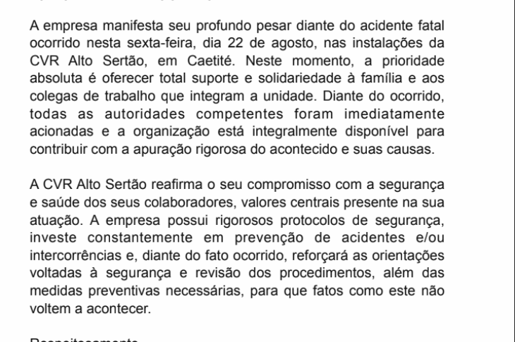 CVR Alto Sertão emite nota após acidente com vítima fatal em Caetité