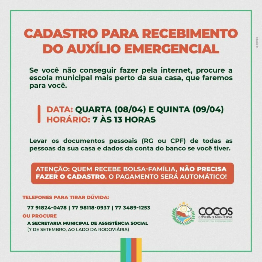 Home » Eventos » Aviso importante da Prefeitura de Cocos para o recebimento do Auxílio EmergencialAviso importante da Prefeitura de Cocos para o recebimento do Auxílio EmergencialAviso importante da Prefeitura de Cocos para o recebimento do Auxílio Emergencial Por Joao Miguel - MTBE: 6889/BA em 7 de abril de 2020 Aviso importante da Prefeitura de Cocos para o recebimento do Auxílio Emergencial FacebookMessengerTwitterLinkedInWhatsApp