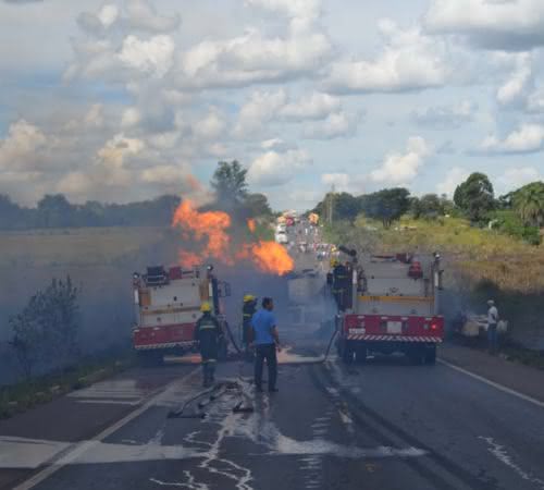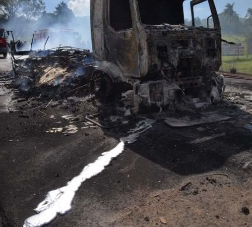 O caminhão que transportava feijão e arroz ficou carbonizado e Danilo Alves Miranda, motorista do caminhão do referido continua internado na Santa Casa. Carlos José Aparecido Santos, ajudante desse caminhão também segue internado em estado grave.