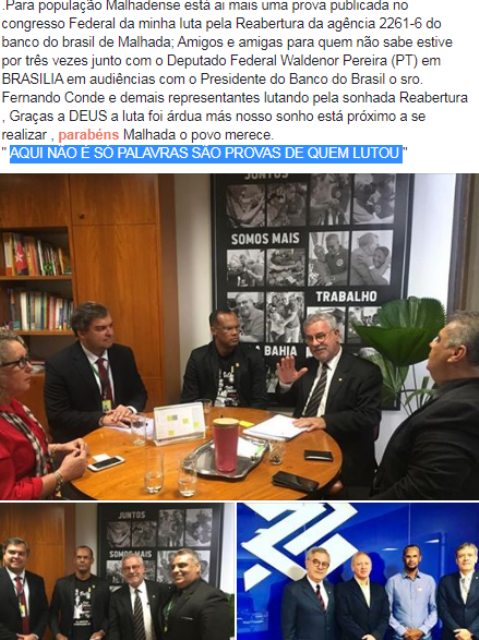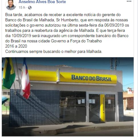 O anúncio da reabertura da agência do banco do Brasil da cidade de Malhada, no Médio São Francisco, publicado pelo portal Folha do Vale, na tarde de sábado (07), gerou uma corrida entre o vice-prefeito Anselmo Alves Boa Sorte (PR) e o vereador Juliene Nunes (PT). Os políticos fizeram solicitações diferentes para que o banco fechado desde dezembro de 2017 fosse reaberto.