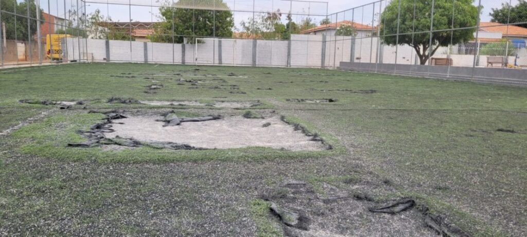 A reportagem esteve no local e constatou que o gramado está muito danificado, o que pode levar a acidentes mais graves. “Nosso bairro está abandonado, o poder público não enxerga a gente aqui”, lembra uma moradora do entorno da quadra.
