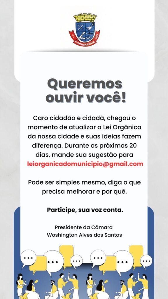 Depois de realizar a audiência pública no dia 15 de setembro, a Câmara disponibilizou o e-mail dedicado à consulta pública. Essa iniciativa visa ampliar a participação da sociedade carinhanhense, garantindo que o maior número possível de pessoas e segmentos sociais possa contribuir com sugestões, opiniões e críticas sobre o novo texto legal.