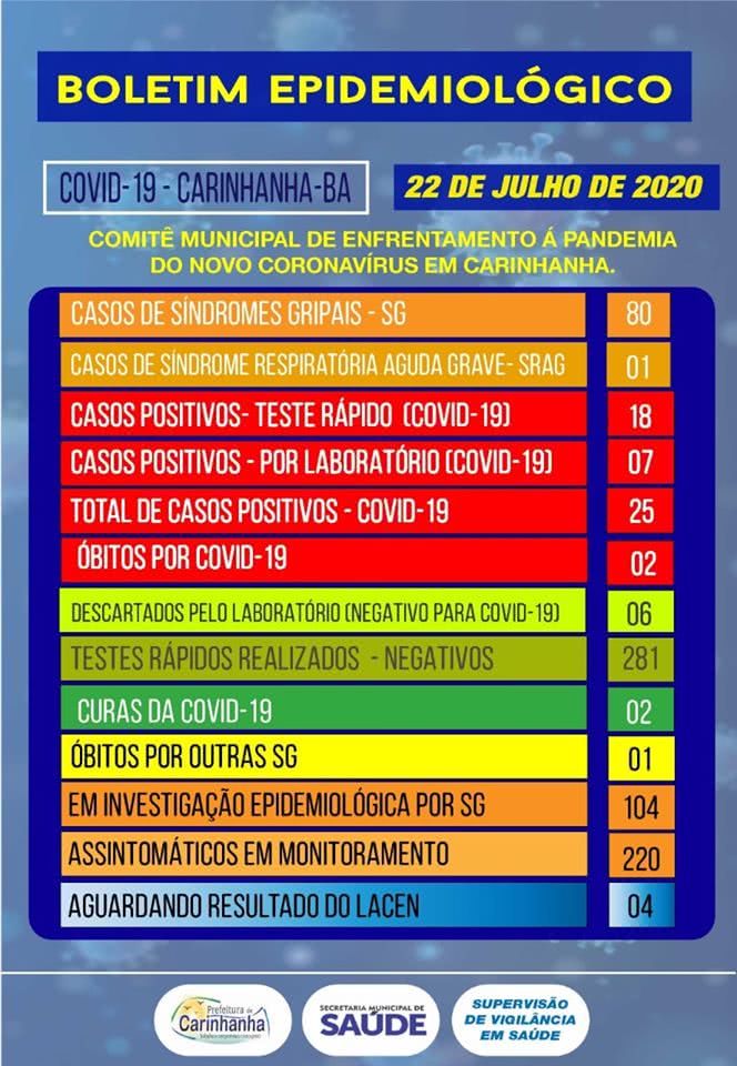 Carinhanha confirmou o vigésimo quinto caso de coronavírus nesta quarta-feira (22). A informação foi dada pela Secretaria Municipal de Saúde, no boletim epidemiológico.