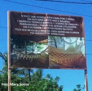 Na placa o morador escreveu: “A você que invadiu esta casa por três 3 vezes em outubro deste ano e roubou:1 garrafa térmica branca/1 ferro de passar/ferramentas/pneus que seriam utilizados em canteiros/As duas redes da foto. Peço que devolva a rede chita vermelha florida, foi presente de minha filha”, finaliza.