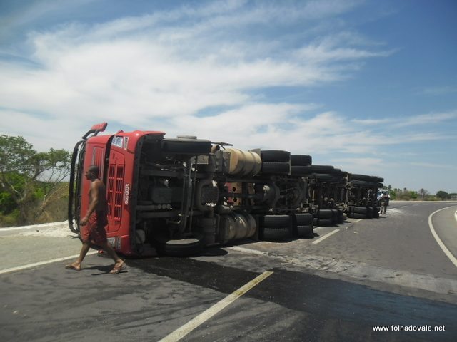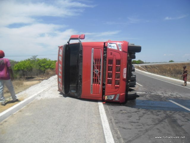 De acordo com informações, após fazer uma curva a carga começou a cair lentamente, fazendo a carreta virar deixando a carga espalha na metade da pista.