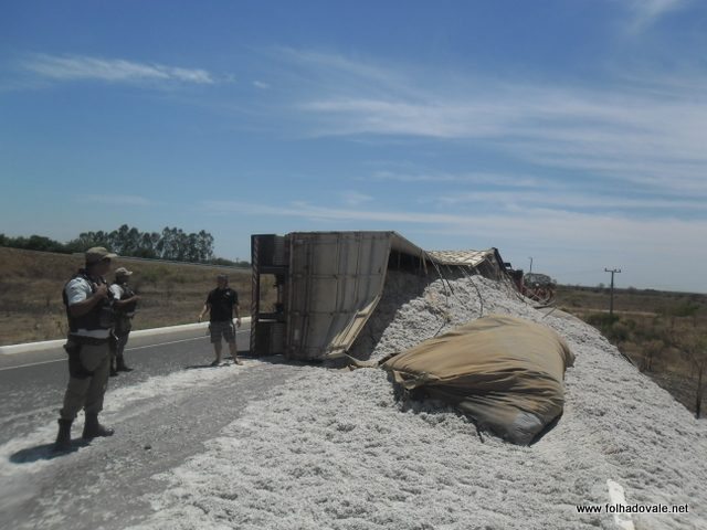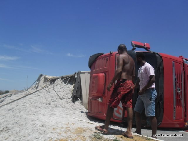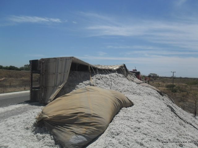 Uma carreta de placa O U G 0025-Luis Eduardo Magalhães, Bahia carregada de semente de algodão, que seguia destino Guanambi,no sudoeste da Bahia, virou na manhã desta segunda-feira(28),na BR-030,no Anel Viário,em Malhada.