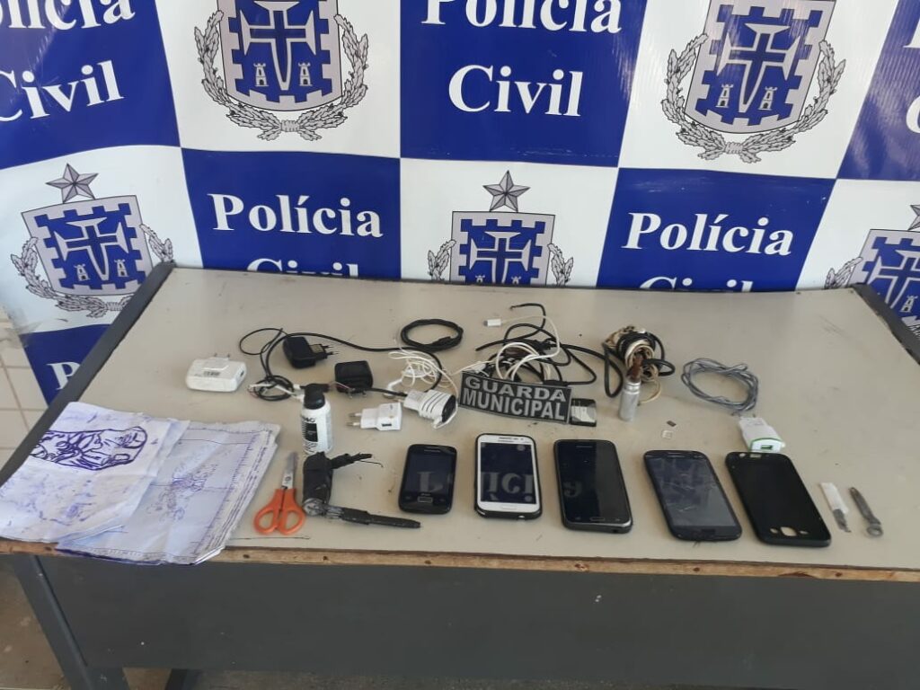 Segundo informação da polícia, quatro aparelhos de celulares, seis carregadores, uma máquina caseira de tatuagem, tinta, lâminas, tesouras, papel com modelos de tatuagens e material cortante foram apreendidos nas celas.