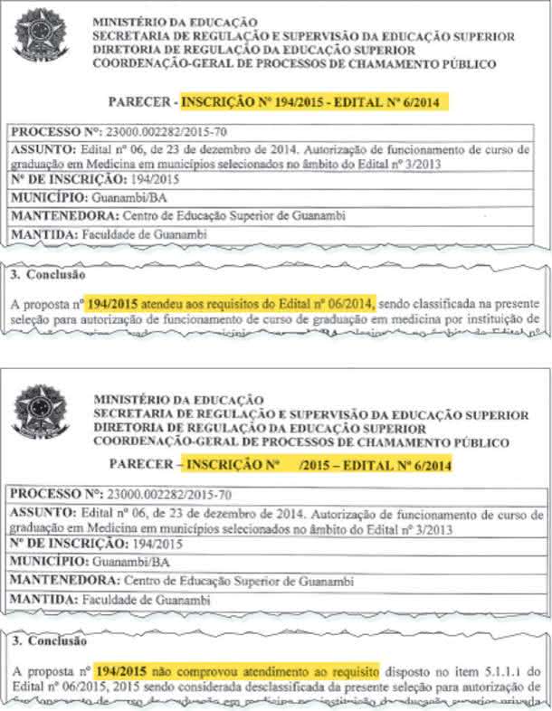 De acordo com o jornal, uma fonte de dentro do MEC teria trocado o parecer que classificava a Faculdade Guanambi por outro que desclassificava isso na véspera da divulgação em 2015. Naquele período, ficou suspensa por mais de um ano por determinação da Justiça, mas em outubro de 2016 a FIP-MOC foi oficializada como vencedora do edital para ofertar o curso através do Mais Médicos.