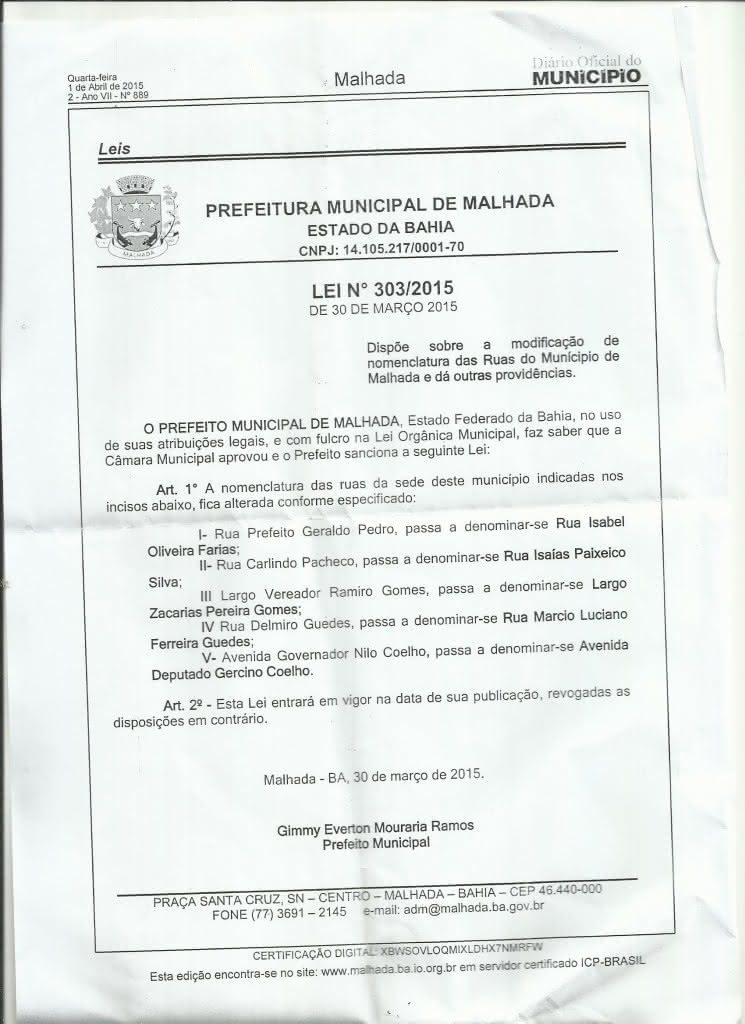 Obedecendo a Lei 303 de março de 2015, o gestor do município de Malhada, Gimmy Everton Moraria Ramos,Dr.Gimmy(PT),alterou os nomes de cinco ruas na sede.