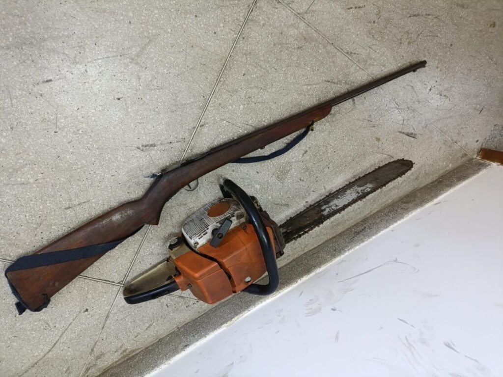 Durante a operação de fiscalização no povoado de Vila São José — Cheira Cabelo, os policiais apreenderam uma espingarda de fabricação artesanal (tipo socadeira) e uma motosserra da marca Stihl.