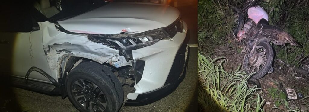 Segundo informações colhidas no local, o automóvel seguia regularmente pela rodovia, quando se deparou com a motocicleta à frente, que apresentava ausência de sinalização luminosa traseira, fator que dificultou a visualização e impossibilitou a frenagem a tempo de evitar o impacto, agravado pelo ofuscamento provocado por faróis de veículos que trafegavam em sentido contrário.