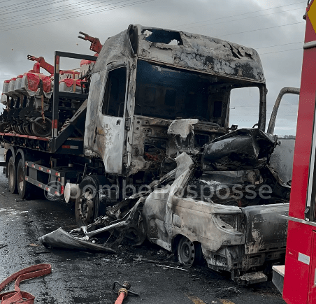 O Corpo de Bombeiros informou que o caminhão seguia normalmente em sua mão de direção quando a Strada invadiu a pista contrária, provocando a batida. Com o impacto, ambos os veículos pegaram fogo, ficando sobre a pista e provocando a interdição total da rodovia.