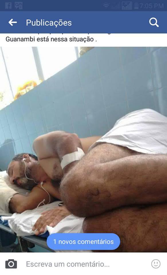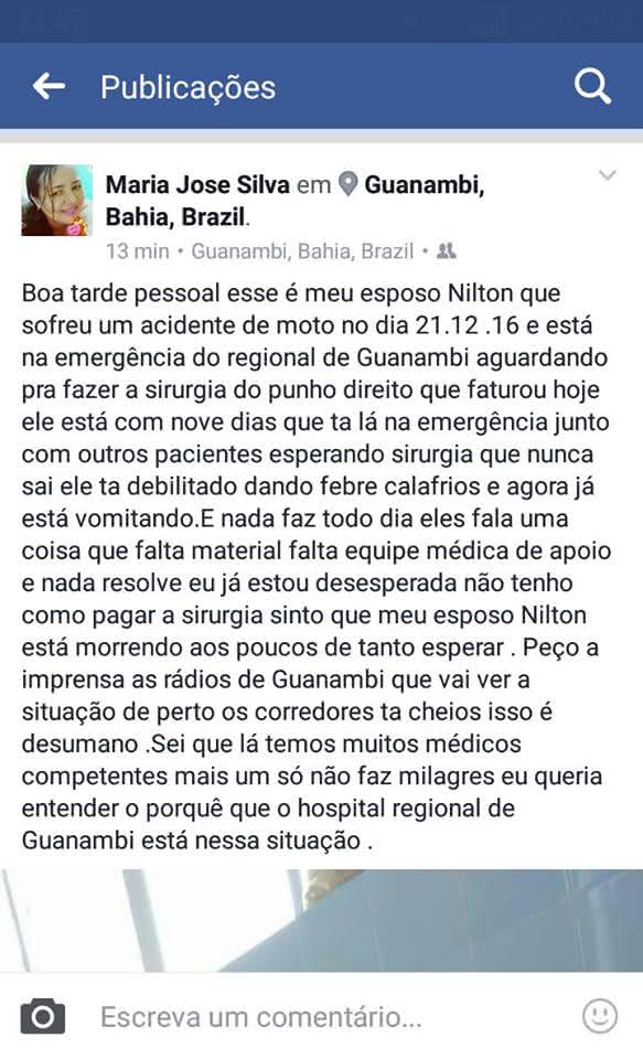 Um homem identificado como Nilton, aguarda há 9 dias na emergência do Hospital Regional de Guanambi, no Sudoeste da Bahia, esperando por uma cirurgia no punho. Ele deu entrada na unidade no dia 21 de dezembro de 2016. Segundo uma postagem da esposa do mesmo, Nilton permanece internado na emergência do maior hospital regional do Sudoeste da Bahia.