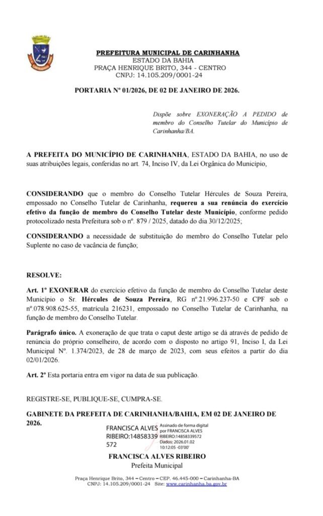 CARINHANHA — O conselheiro tutelar Hércules Pereira de Souza pediu exoneração do cargo que ocupava no município de Carinhanha, na região sudoeste da Bahia. O ato foi oficializado e publicado na edição do Diário Oficial do Município (DOM) do dia 2 de janeiro.
