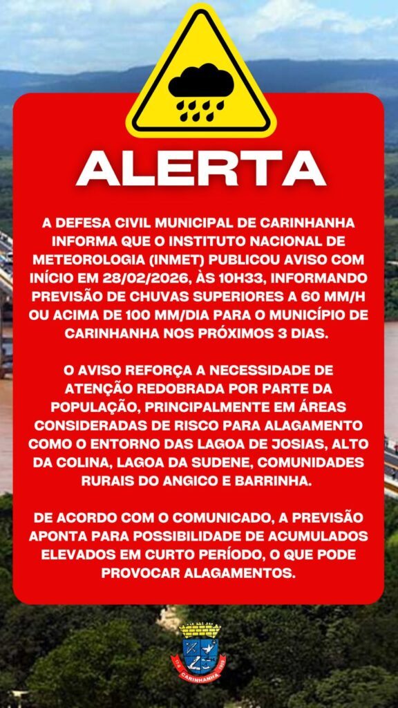 CARINHANHA — A Defesa Civil de Carinhanha, na região sudoeste da Bahia, emitiu na tarde de sábado (28), um alerta vermelho de grande perigo de chuvas intensas para o município. O aviso de chuvas intensas é válido até terça-feira, dia 3 de março.