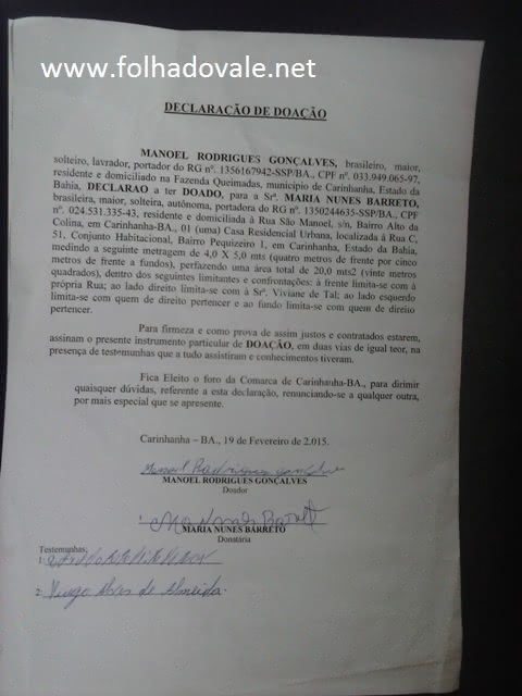 De acordo com Branca, como a residência não pode se vendida, ele (Manoel), fez um documento doando a casa para ela, como se não tivesse recebido nada em troca. “Fiz o negocio e depois fui colocada da casa para fora, agora quero meu dinheiro de volta”, contou Branca na delegacia.