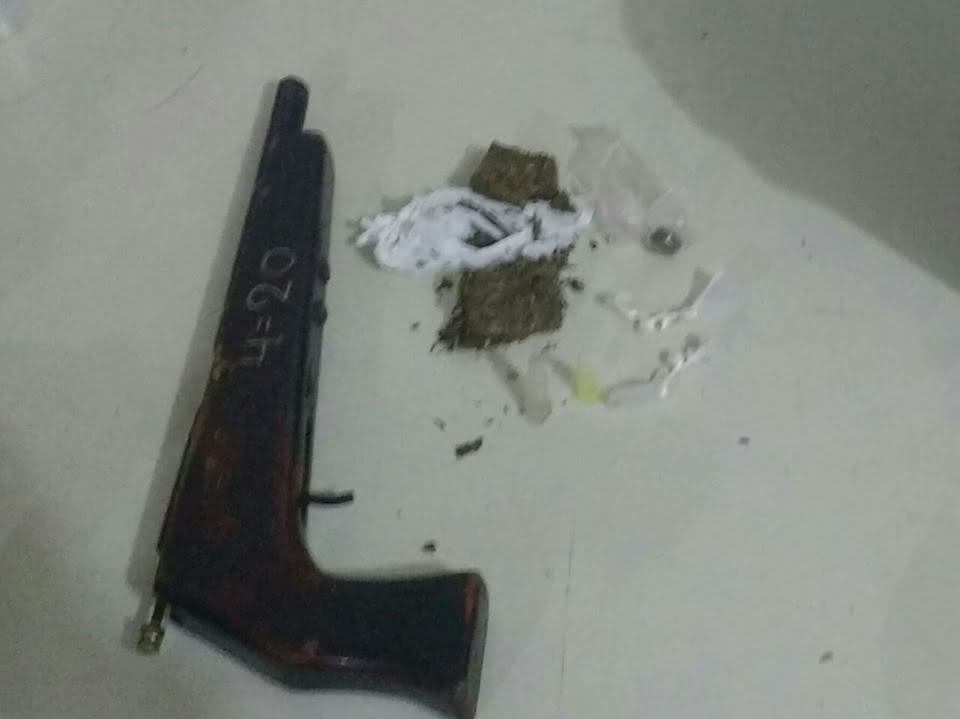 Ao portal, os policiais afirmaram que durante a averiguação feita na casa dos suspeitos foi encontrado segundo a polícia, uma arma de fabricação artesanal, trouxa de maconha e dois pés de maconha. “A gente foi informado que eles estavam escondidos na residência dessa senhora identificada por Maria de Lurdes, que por sinal é avó deles. Quando foi dada voz de prisão cinco ou seis pessoas partiram pra cima da polícia, então atiramos para cima para evitar tumulto”, Disse soldado Rocha.