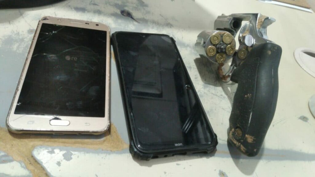 No carro foi encontrado um revólver calibre 38 e municiado com cinco munições, além de dois celulares. Os dois homens dão estavam com documentos.