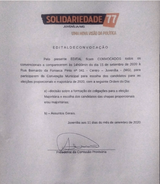 Home » Juvenília » Edital de convocação da convenção do Partido Solidariedade de JuveníliaEdital de convocação da convenção do Partido Solidariedade de JuveníliaNo evento serão deliberados os nomes de candidatos a prefeito, vice e vereador. Por Joao Miguel - MTBE: 6889/BA em 11 de setembro de 2020 (atualizado em 13 de setembro de 2020) Convocação FacebookMessengerTwitterLinkedInWhatsApp