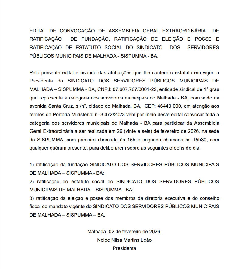 MALHADA — O documento convoca toda a categoria dos servidores municipais de Malhada–BA, associados ao Sispumma, para participarem da Assembleia Geral Extraordinária, a ser realizada no dia 26 (vinte e seis) de fevereiro de 2026, na sede do sindicato, com primeira chamada às 15h.