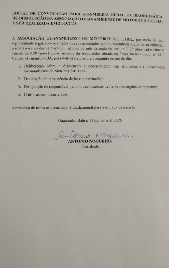 Home » Geral » Edital de Convocação para Assembleia GeralEdital de Convocação para Assembleia GeralA Assembleia Geral realiza-se nesta quarta-feira (21), na sede da Assossiação, na Praça Jacinto Lobo. Por Joao Miguel - MTBE: 6889/BA em 21 de maio de 2025 FacebookMessengerTwitterLinkedInWhatsApp