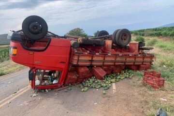 Caminhão carregado com mangas capota na BA-148, entre Brumado e Dom Basílio