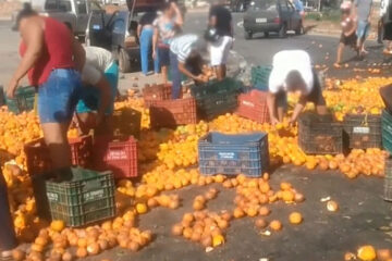 Caminhão carregado com frutas tomba na rotatória de acesso das rodovias BA-262 e BR-030 em Brumado