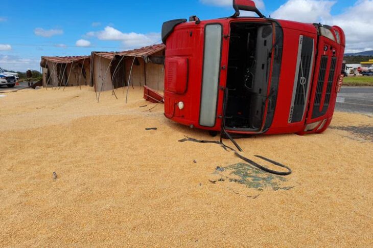 Carreta furtada carregada com milho em Igaporã tomba na BR-030 em Brumado