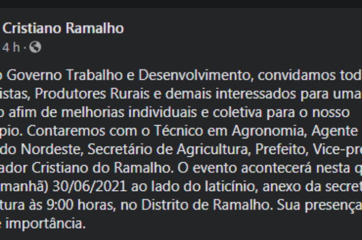 Vereador ignora pandemia e convida pecuaristas e produtores para reunião em Feira da Mata