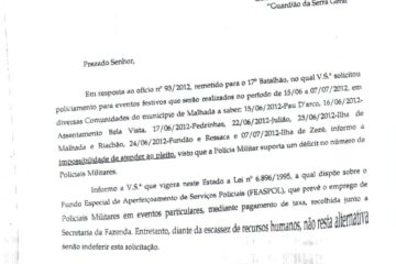 Resposta do 17° Batalhão ao município de Malhada em relação à segurança nos eventos juninos