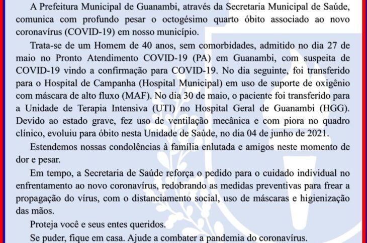 Guanambi registra mais um óbito por Covid-19 e chega a 84 vítimas da doença