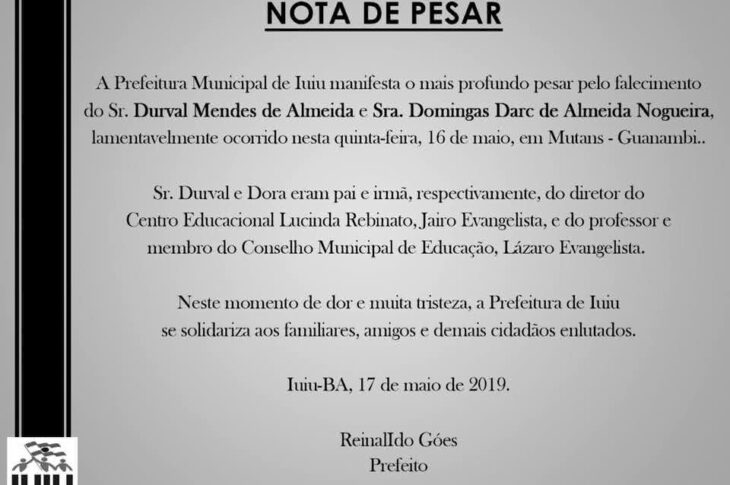 Prefeitura de Iuiú emite nota de falecimento pela morte da professora Domingas em Guanambi