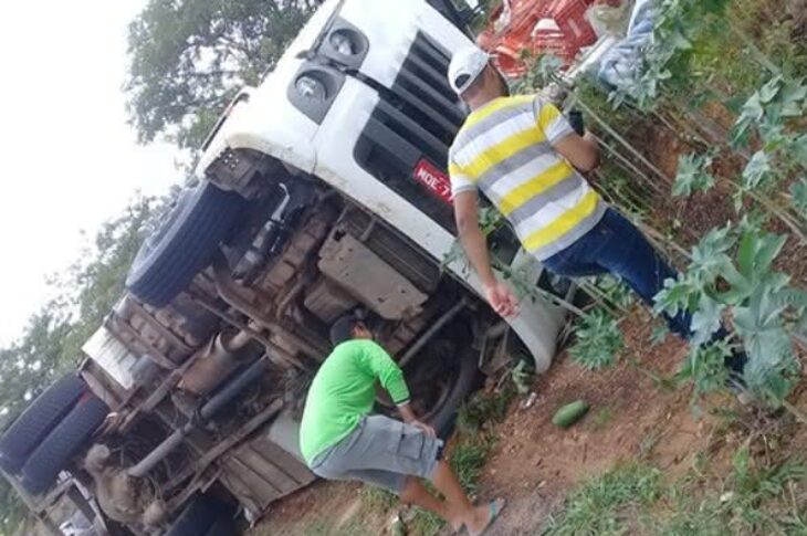 Caminhão carregado com mamão tomba na Serra dos Brindes em Guanambi
