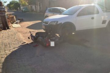 Mulher fica ferida em colisão entre moto e caminhonete em Guanambi