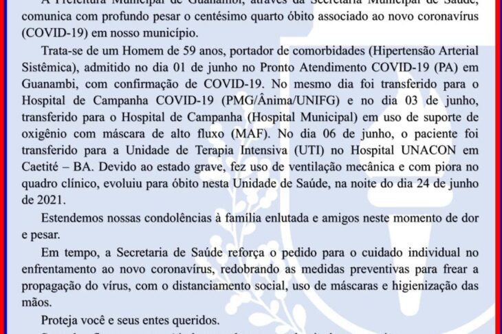 Guanambi registra centésimo quarto óbito por complicações da Covid-19
