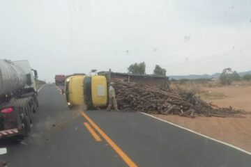 Caminhão carregado com lenha tomba na BR-030 em Guanambi