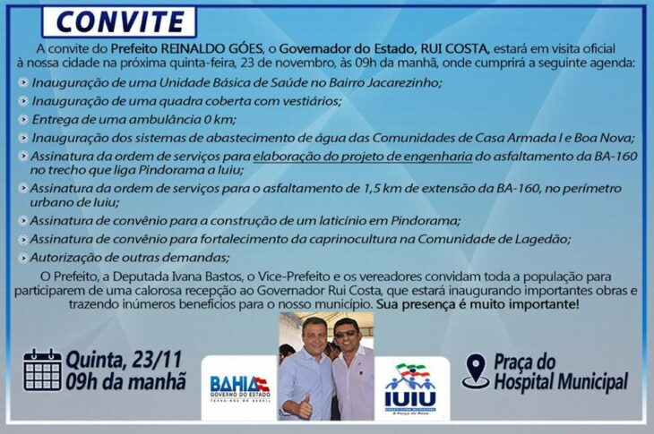 Governador da Bahia inaugura obras em Iuiú no dia 23 de novembro